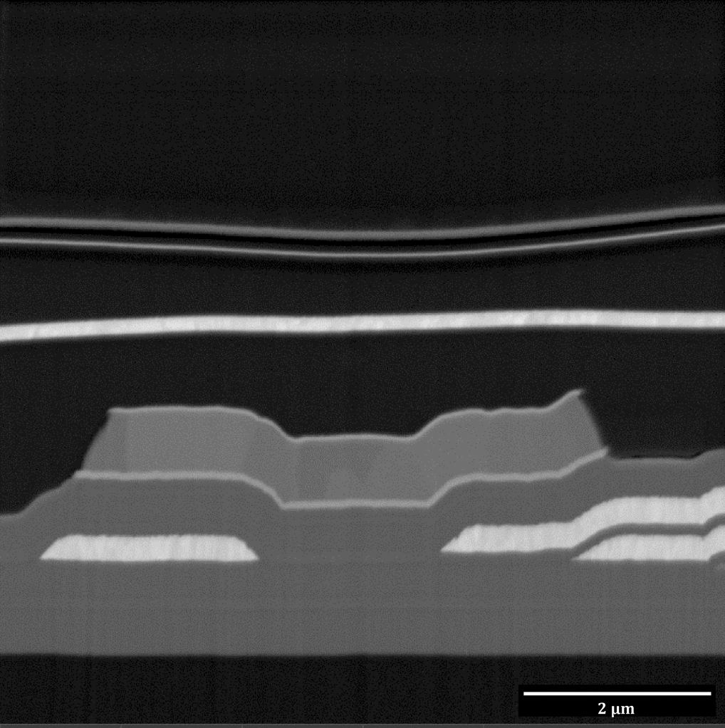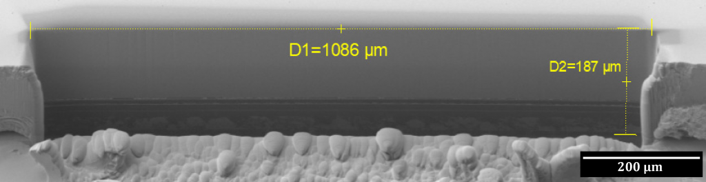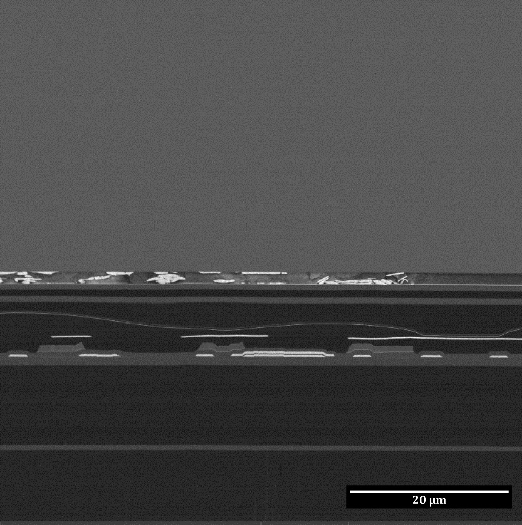 На рисунке 1 показано поперечное сечение шириной 1086 мкм и глубиной 187 мкм, вытравленное при токе ионного пучка 2 мкА и ускоряющем напряжении 30 кВ. Контрастные изображения металлических слоев дисплея получены с помощью Mid-Angle BSE – встроенного в колонну детектора отражённых электронов, рассеянных на средние углы (рисунки 2 и 3).