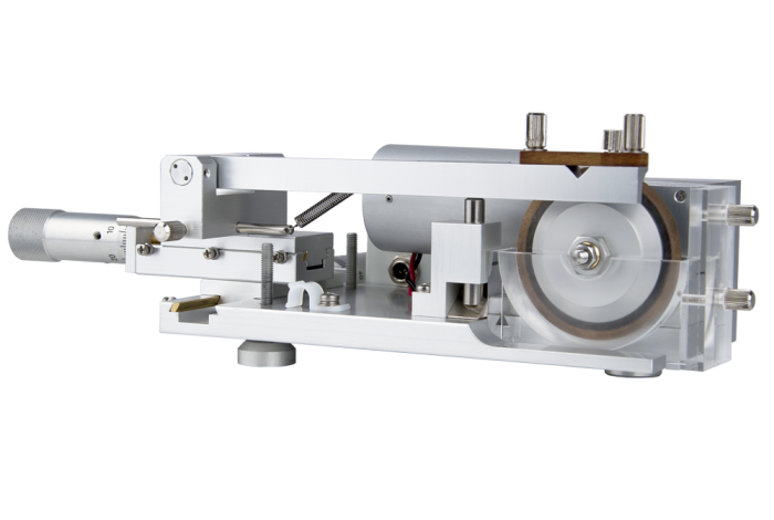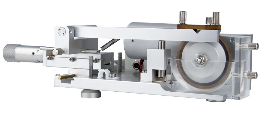 MICROSAW MS3 приводится в действие электромотором со спиральной передачей. Питание мотора 12V DC обеспечивает отдельный блок. Скорость вращения отрезного круга непрерывно варьируется в широком диапазоне. Имеется регулировка позиции области отреза, места крепления образца, возможность натяжки материала и установка упора. Два настраиваемых винта в нижней части прибора для точной регулировки горизонта под оптическим стереомикроскопом.