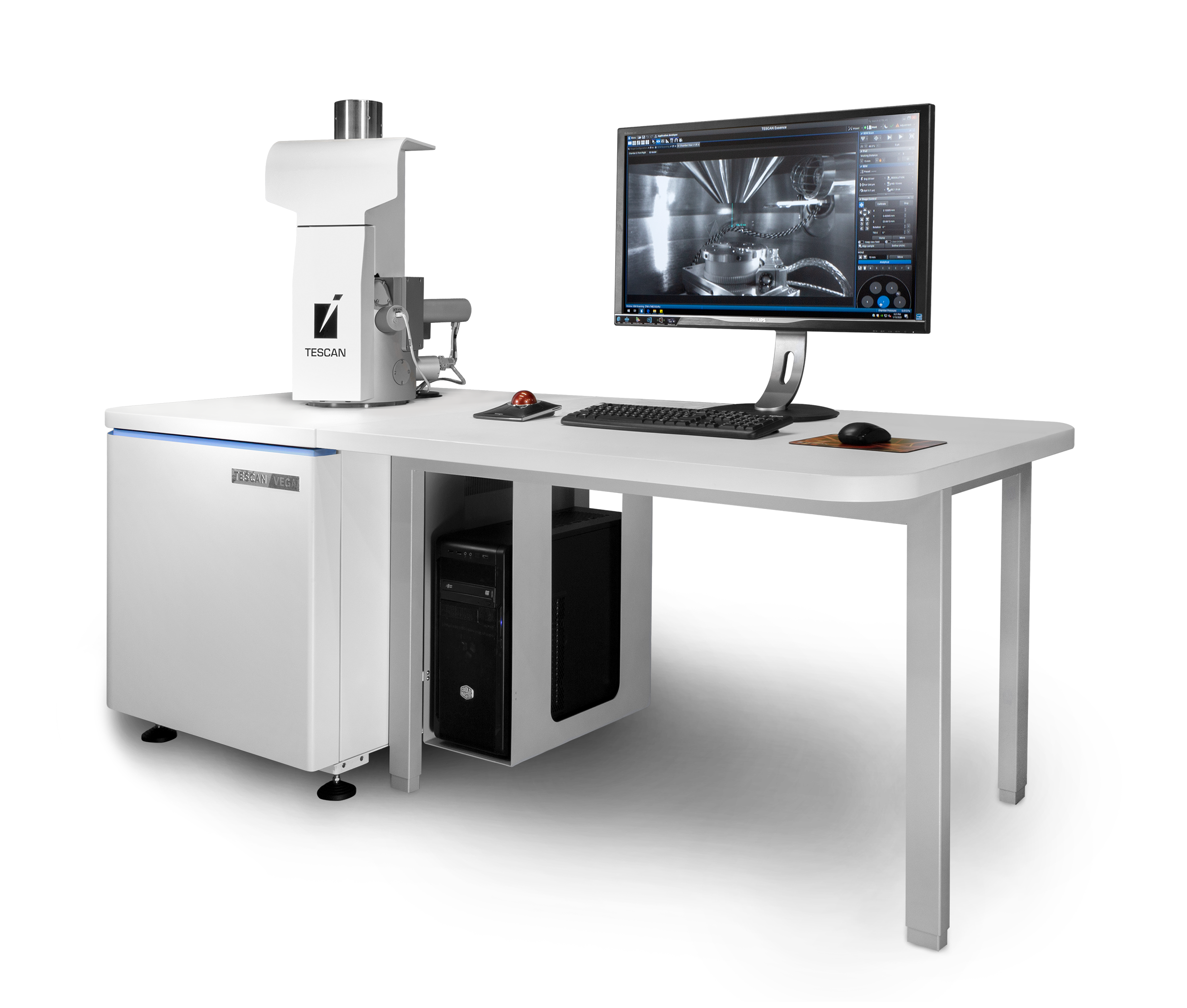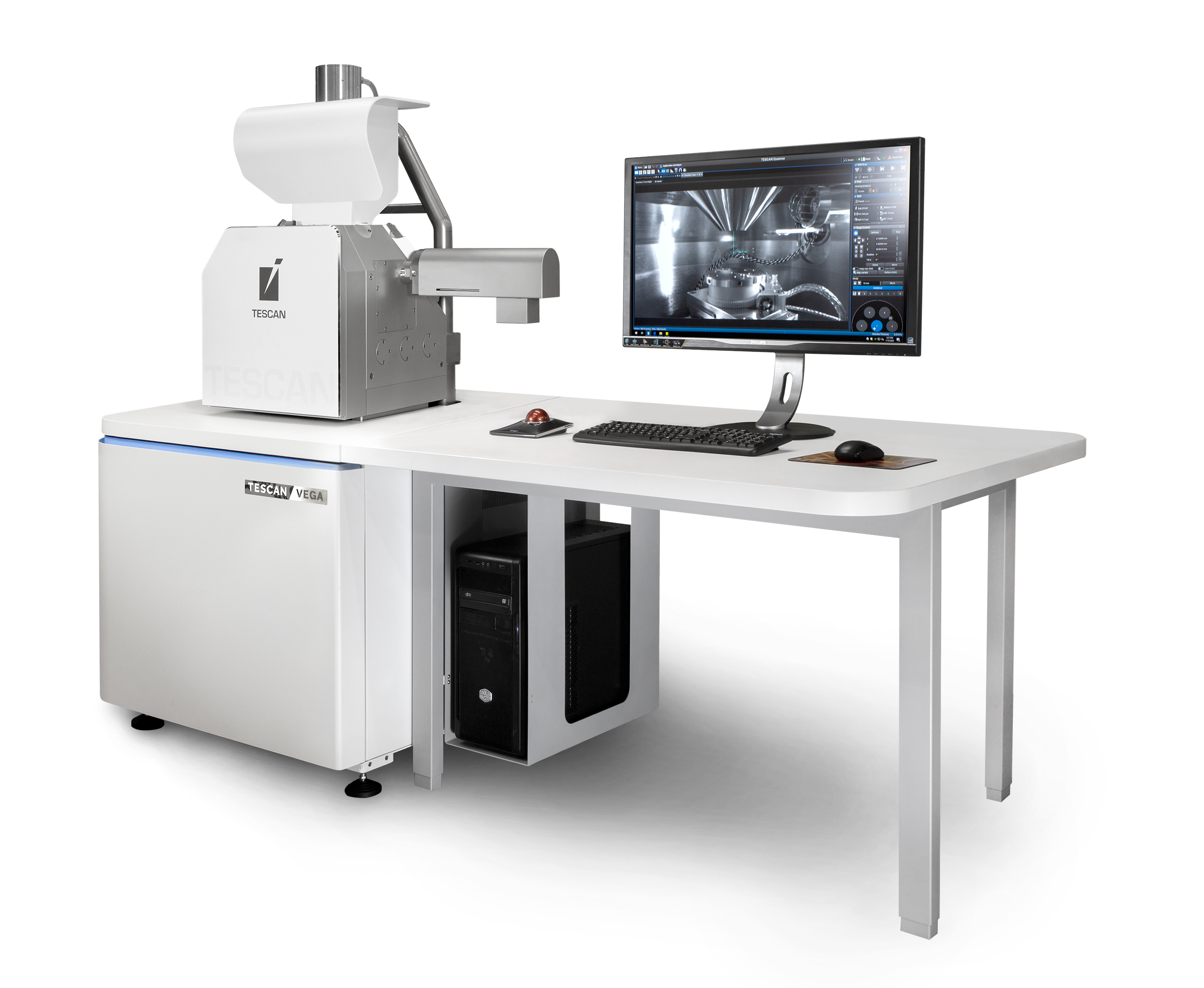 Управление микроскопом TESCAN VEGA осуществляется из многопользовательского программного обеспечения TESCAN Essence™, которое имеет большое количество инструментов для ускорения аналитической работы, таких как функция быстрого поиска, наборы предустановок, отмена последней команды. Программное обеспечение TESCAN Essence™ позволяет пользователю выстраивать рабочий процесс в соответствии с его уровнем опыта и/или конкретными требованиями. Кроме того, виртуальная 3D-модель коллизий Essence™ Collision model точно воспроизводит внутреннее пространство камеры и отображает в реальном времени размеры, расположение и перемещение столика с образцами и оборудования, установленного внутри. Модель Essence™ Collision model предсказывает опасность или безопасность предполагаемых перемещений столика относительно частей камеры микроскопа для каждой конкретной процедуры съемки изображения или проведения анализа, чтобы столкновение образцов с любыми установленными в камере детекторами было практически невозможно; виртуальная 3D-модель коллизий включает в себя также сторонние устройства, например, столиков на нагрев или на растяжение/сжатие in-situ.